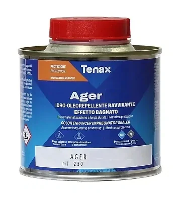TENAX AGER 250ml je vodě a olejům odpudivá impregnace s mokrým efektem výrazňujícím barvu kamene (mramor, žula, travertin, aglomeráty a přírodní kámen obecně pro vnější i vnitřní použití, na kámen